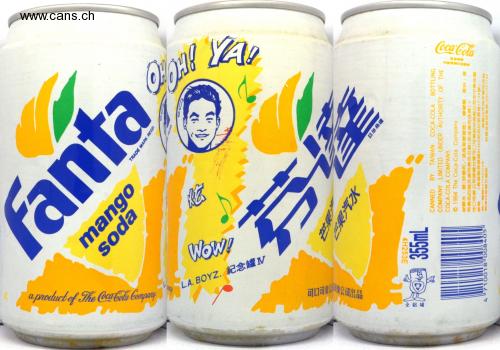 fanta soda mango TRADE MARK REGD REGO OOH! YA! a product of The Coca Cola Company L. A. BOYZ.紀念罐Ⅳ WOW! 可口可樂公司整公司出品 芬座 芒果 三果汽水 註冊商標 全鋁罐 Coca-Cola 高縣台可特字冕拾柒號 消費者服務專線(080)251188 355mL CANNED BY TAIWAN COCA-COLA BOTTLING COMPANY LIMITED UNDER AUTHORITY OF THE COCA-COLA COMPANY. © 1994 The Coca-Cola Company 碳酸水、糖(砂糖和/或高果糖糖漿)、檸檬酸、香料 食 用黃色四號及食用黃色五號(核准食用色素)。 可口可樂公司授權台灣可口可樂股份有限公司在中華民國 (高雄縣燕撇82405安招村新厝巷17-24號) 4710018 008405 -网9號5477407708 製造日期棚於機底