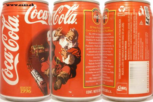 CONT. NET 35 0 355 c.C. CHRISTMAS SOFT DRINK. THE TRUE TRUE presented in 1962. Ea in 1962. In this christmas greet sud greet your Or with a Cocan a Coca-Cola Coca Cola BIEMP PRE TO Container Recyclable CocaColae The Old Easter Easter Coca-Cola from "His" Sundblom ' In 1931 the Compah Company Coca-Cola commissioned to commissioned artist Haddon H. Sundblom and H. Sundblom create illustrations of Vicones del Viejo Pascuero. Since then Since then, the people from all over the world all over the world have identified this Viado this Old Pascuero with the Compn with the Company Coca Cola. Сосa-Cola This creation titled titled "Christmas Greeting'E Christmas" fre guests to frost .. well frozen. THE TRUE WRONG TM EDITION nineteen ninety six NET 355 C.C. Coke CONT. NET 35 TM ca Cola CONSUME PREFERENTIALLY BEFORE THE INDICATED DATE UNDER THE MANUFACTURING LOT (SEE THE BASE OF THE CAN) FANTASY DRINK INGREDIENTS: CARBONATED WATER, SUGAR, CARAMEL COLOR. PHOSPHORIC ACID, NATURAL FLAVORS AND CAFFEINE. ENVASES CENTRAL S.A. - CALLE MIRAFLORES N ° 8755 - RENCA CANNER AUTHORIZED BY THE COCA-COLA COMPANY BEEF. SESMA N ° 9938 OF 04-20-95. 1996 THE COCA-COLA COMPANY CHILEAN MANUFACTURING KEEP THE CITY CLEAN NOT THROWING THIS CONTAINER IN THE <700 O0 L PUBLIC ROAD INFORMATION CONSUMER 00-21 95