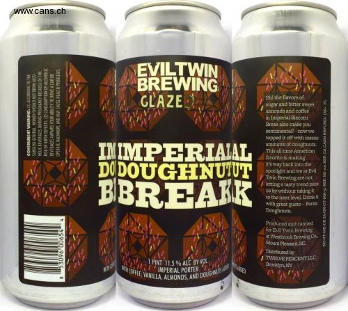 IMPERIAL PORTER 1 WITH COFFEE, VANILLA, ALMONDS, AND DOUGHNUTS ADDED 1 PINT 11.5 % ALC BY VOL EVILTWIN BREWING GLAZE Did the flavors of sugar and bitter sweet almonds and coffee in Imperial Biscotti Break also make you sentimental? - now we topped it off with insane amounts of doughnuts. INIMPE RIAAL This all time American favorite is making it's way back into the spotlight and we at Evil Twin Brewing are not letting a tasty trend us by without taking it DO DOUGHNUTUT BBREAK pass to the next level. Drink it with great gusto - Forza Doughnuts. Produced and canned for Evil Twin Brewing at Westbrook Brewing Co., Mount Pleasant, SC. Distributed by TWELVE PERCENT LLC Brooklyn, NY US ADDED WITH COFFE IMPERIAL PORTER GOVERNMENT WARNING: (1) ACCORDING TO THE SURGEON GENERAL, WOMEN SHOULD NOT DRINK ALCO- HOLIC BEVERAGES DURING PREGNANCY BECAUSE OF THE RISK OF BIRTH DEFECTS. (2) CONSUMPTION OF ALCOHOLIC BEVERAGES IMPAIRS YOUR ABILITY TO DRIVE A CAR OR OPERATE MACHINERY, AND MAY CAUSE HEALTH PROBLEMS. 8 75900 960ES NY-VT-ME-DE-IA-OR-CT-MA-5c REF. MI-10c REF. CA CASH REFUND, OK+ FL