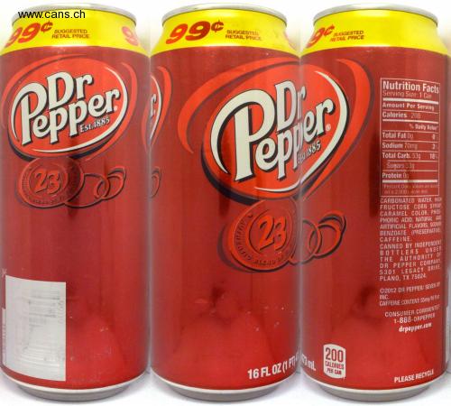 : יציזפ Npפוט SUGGESTED RETAIL PRICE 99¢ SUGGESTED RETAIL PRICE SUGGESTED RETAIL PRICE ODr Pepper OD epper Nutrition Facts Serving Size: 1 Can Amount Per Serving Est.1885 Calories 200 % Daily Value Total Fat 0g (23)) Sodium 70mg 3% USRA885 18 Total Carb. 53g Sugars 53g Protein 0g *Percent Daily, Values are based on a 2,000 calorie diet. CARBONATED WATER, HIGH FRUCTOSE CORN SYRUP, CARAMEL COLOR, PHOS- PHORIC ACID, NATURAL AND ARTIFICIAL FLAVORS, SODIUM BENZOATE (PRESERVATIVE), CAFFEINE. CANNED BY INDEPENDENT BOTTLERS UNDER THE AUTHORITY OF DR PEPPER COMPANY, 5301 LEGACY DRIVE, PLANO, TX 75024. 25 BLEND OF ©2012 DR PEPPER/ SEVEN UP INC. CAFFEINE CONTENT: 55mg/16 t 0z CONSUMER COMMENTS? 1-888-DRPEPPER drpepper.com 200 IT73 mL 16 FL OZ (1 P CALORIES PER CAN PLEASE RECYCLE a02V O 60 F