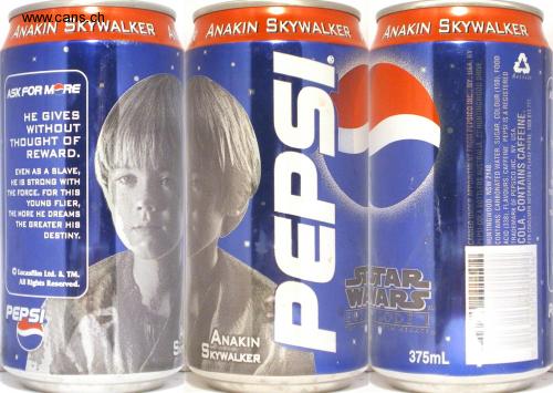 ANAKIN SKYWALKER ANAKIN SKYWALKER ANAKIN SKYWALKER Recycle ASK FOR MORE HE GIVES WITHOUT THOUGHT OF REWARD. EVEN AS A SLAVE, HE IS STRONG WITH THE FORCE. FOR THIS YOUNG FLIER, THE MORE HE DREAMS THE GREATER HIS DESTINY. STAR WAARS CODE I © Lucasfilm Ltd. & TM. All Rights Reserved. TM PEPSI M MENACE ANAKIN S SKYWALKER 375mL CANNED UNDER APPOINTMENT FROM PEPSICO INC., NY, USA, BY PEPSI-COLA BOTTLERS AUSTRALIA, 27 HUNTINGWOOD DRIVE, HUNTINGWOOD, NSW 2148. CONTAINS: CARBONATED WATER, SUGAR, COLOUR (150), FOOD ACID (338), FLAVOURS, CAFFEINE. PEPSI IS A REGISTERED TRADEMARK OF PEPSICO INC., NY, USA. COLA. CONTAINS CAFFEINE. FOR CONSUMER INFORMATION PLEASE PHONE: 1800 813 777.
