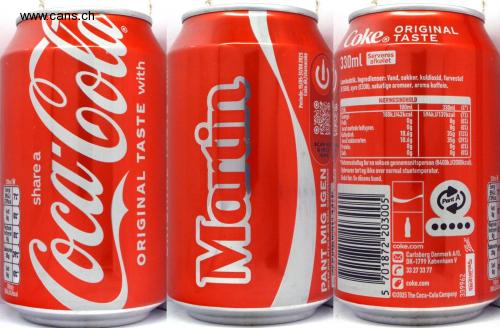 35g 330ml Energi 594 7 139kcal Fedt Kettede fedtsyrer 0% O 0% 100ml: 100/42kcal share a ORIGINAL TASTE with Periode: 15/05-31/08 2025 Coke.dk/shareacoke Coke 330ml ORIGINAL Ⓡ TASTE Serveres afkølet Laskedrik. Ingredienser: Vand, sukker, kuldioxid, farvestof E1500), syre (E338), naturlige aromaer, aroma koffein. NÆRINGSINDHOLD 100ml PER: 180kJ/42kcal 330ml (%*) 594kJ/139kcal (7%) Energi: Fedt: Og Og (0%) heraf mættede fedtsyrer: Og Og (0%) Kulhydrat: 10.6g 35g (13%) heraf sukkerarter: 10.6g 35g (39%) SCAN MIG Protein: Og Og (0%) 06 VIND FEDE Salt Og Og (0%) PREMIER PANT MIG IGEN JEG ER IKKE AFFALD SKAL GENANVENDES Referenceindtag for en voksen gennemsnitsperson (8400kJ/2000kcal). Opbevares tørt og ikke over normal stuetemperatur. Bedst før: Se dåsens bund. 5 701872 203005 coke.com Pant A Carlsberg Danmark A/S, DK-1799 København V 33 27 33 77 coke.com S2025 The Coca-Cola Company Ball 16D51BF08A 339962 18014 Energ 59407 139kcal Fedt Og Mattede fedtsyre Og Sukkera 35g
