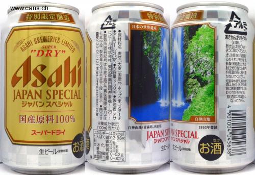 特別限定醸造 A 特別服 アルミ 日本の世界遺産 缶底中段、製造年月旬は缶底下段に表示 問合せ ●製造所固有記号は缶底上段左、賞味期限(年月)は ヒビール株式会社 東京都墨田区吾妻橋1-23-1 アルコール分5%●内容量 350ml 製造者 アサ 原材料名 麦芽(大麦(国産))、ホップ、米、スターチ せは サチ 0120-011-121 https://www.asahibeer.co.jp ASAHI BREWERIES SUPER LIMITED “DRY" Asahi JAPAN SPECIAL ジャパンスペシャル 国産原料100% 用定釀造 A アルミ あきかんはリサイクル <お願い> あき缶は捨てない ようご協力ください。 注意缶が破損す るおそれがあります。 衝撃 ・ 凍結をさけ、直 射日光の当たる車内 や高温の所に長く置 かないでください。 妊娠中や授乳期の飲 酒は、胎児・乳児の発 育に悪影響を与える おそれがあります。 飲酒は20歳に なってから。 4 901004 045638 白神山地 JAPAN SPAN SPECIAL ジャパンパンスペシャル 1993年登録 さけ 生ビール 生ビール(発泡) 栄養成分表示 スーパードライ さけ さけ 生ビール (非熱処理) お酒 糖 食物繊維: 0~0.2g 食塩相当量:0~0.02g 西 (100ml当たり) エネルギー:40kcal たんぱく質:0.2~0.6g 脂 質:0g 白神山地 (青森県、秋田県) 炭水化物:2.3g 質:2.3g お酒