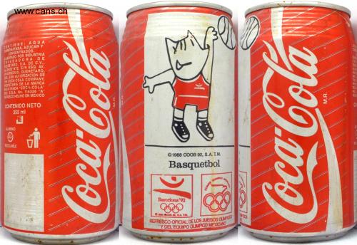 CONTIENE: AGUA CARBONATADA, AZUCAR Y CONCENTRADOS. ELABORADO POR INDUSTRIA ENVASADORA DE QUERETARO, S.A. DE C.V., ALLENDE NTE. S/N ESQ. AV. UNIVERSIDAD, QUERETARO, ORO. CON AUTORIZACION DE THE COCA-COLA COMPANY, PROPIETARIA DE LA MARCA REGISTRADA "COCA-COLA" REG. S.S.A. No. 116326 "A" REFRESCO HECHO EN MEXICO CONTENIDO NETO 355 ml ALUMINIO E RECICLABLE 501055 30 M.R. M.R. 1988 COOB 92, S.A. T.M. Basquetbol Barcelona '92 OLIMPICO COMITE D 1088 0008, 92, 8.A. T REFRESCO OFICIAL DE LOS JUEGOS OLIMPICOS Y DEL EQUIPO OLIMPICO MEXICANO MPICOS HO M.R. CO CAR ELAS EN QUES ALLE UNIVER ORD THE PROP REG REFRE CON