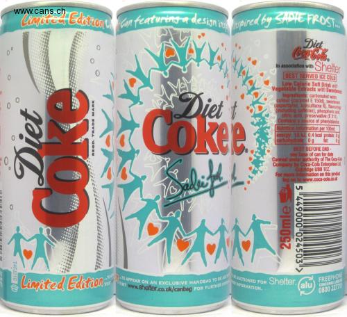 TO APPEAR ON AN EXCLUSIVE HANDBAG TO BE AUCTIO pired by SMPHE FROST. VISIT WWw.sheliter.co.uk/canbag FOR FURTHER INFOR Cigited Editon Can featurinsa design in Diet Coca-Cola Shelter 00 In association with Diet Coke BEST SERVED ICE COLD Low Calorie Soft Drink with Vegetable Extracts with Sweelenens Ingredients: carbonated water, colour (caramel E 150d), sweeteners (aspartame, acesulfame K), flavourings (including caffeine), phosphoric aci, citric acid, preservative (E 211). Contains a source of phenylalaníne. Nutrition Information per 100ml: energy: 1.6 kJ, 0.4 kcal protein: 0g fat: carbohydrate: 0g BEST BEFORE END- see base of can for date Canned under authority of The Coca-Cola Company by Coca-Cola Enterprises Ltd, Oxbridge UB8 1EZ For more information on this product log on to www.coca-cola.co.uk 100 000 000 Limited Edition TO AP VISIT BE AUCTIONED FOR MER INFORMATION. FREEPHONE CONSUMER CARELN Shelter. www.shelter.co.mik/canbag FOR FURTHER IN alu 0800 227711 et T4FJ21C REGD. TRADE MARK 250mle 5 449000 024503>