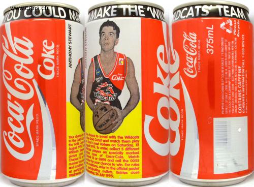 Your chance to r chance to travel with the Wildcats to the Gold Cohe Gold Coast and watch them play August 1995. 1995. To enter, collect 5 different the Gold Coo Gold Coast Rollers on Saturday, 12 number for youer for your chance to win. For rules and condifionsonditions, refer to the official poster dure cans of Coca-Cola. Watch idcats players on specially marked paniciparting outlets. Entries close Connel 10 or GWN and call the 0055 ndhesday, 26 July 1995. OU COULD M MAKE THE W DCATS TEAM Enjo COKC Ractoh DCATS Your chance to the Gold Co Wildcats ploye picture cans Channel 10 or number for your players on specially marked at particpatiy Wednesday TRADE MARK REGD. TRADE MARK REGD. ANTHONY STEWART S N O L TRADE MARK REGD Coca-Cola TRADE MARK REGD. 375ML PREPARED AND CANNED BY CCA BEVERAGES. 71 MACOQUARIE STREET SYDNEY 2000. AUSTRALIA. UNDER AUTHORITY OF THE COCA COLA COMPANY OWNER OF THE TRADE MARKS COCA COLA AND COKE.CONTAINS CARBONATED WATER. SUGAR COLOUR (150). FOOD ACID (338). FLAVOURS. CAFFEINE. Please CONTAINS CAFFEINE. CONSUMER INFORMATION CALL 1 800 025123. Recycle MARKOLOR'M PROCESS PATENTED