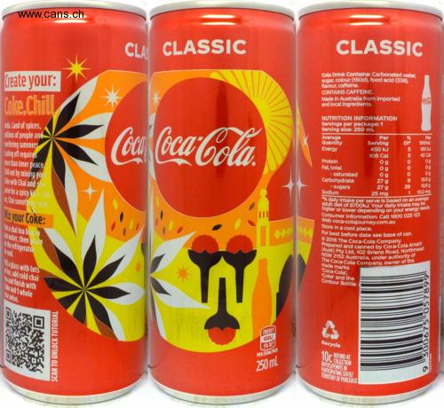 higher or lower depending on your energy needs. Prepared and canned by Coca-Cola Amatil (Aust) Pty Ltd, 102 Briens Road, Northmead NSW 2152 Australia, under authority of The Coca-Cola Company, owner of the CLASSIC CLA CLASSIC Cola Drink Contains: Carbonated water, sugar, colour (150d), food acid (338), flavour, caffelne. CONTAINS CAFFEINE. Made In Australia from imported and local ingredients. Create your: Coke.Chill NUTRITION INFORMATION Servings per package: 1 Serving size: 250 mL Coca-Coca-Cola Per 100mL 180 kJ 43 Cal 0g 09 0g 10.6g 10.6 g 10.0 mg Per a Land of spices, tlions of people and Sweltering summers Cnling of requires Mre than inner peace Oil out by mixing your Cole with Chai and star aise for a spicy kick. Go Chai something new. Average Quantity Energy DI* Serving 450 kJ 108 Cal 0g og 0g 27 g 27 g Protein Fat, total saturated Carbohydrate - sugars Sodium 9. 29 25 mg "% dally intake per serve is based on an average adutt diet of 8700KJ. Your daily intake may De Consumer Information: Call 1800 025 123 Web coca-colajourney.com.au Store in a cool place. For best before date see base of can. 2018 The Coca-Cola Company. a your Coke: hta chai tea bag in ht water, then place hthe refigerator hrcol. trade marks "Coca-Cola', "Coke' and the Contour Bottle. Fla glass with lots tice add cold chai ta and finish with Goke and 1 whole thar anise. ENERGY 450KJ 5% DI Rocycle 10c REFUND AT COLLECTION DEPOTS/POINTS IN PARTICIPATING STATE TERRITORY OF PURCHASE PER 250mL PACK 250 mlL SCAN TO UNLOCK TUTORIAL 668 0IS2900£1I 6