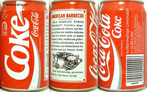 Garnish with salad and ketchup. A AMERICAN BARBECUE NO. 6 BARBECUE BURGERS NO. "BRO BROOKLYN ": Fresh, stomach- res season the minced meat and knead CANS RECYCLING Cover the grill grate with aluminum foil ten, G (so that the pieces are not too dark (dani grill all around for 4 minutes. will Cut the bun on the Toast the grill, top with herb butter Gril streid spread and with tomato, cucumber, Stle Ice Ice cold coke with it, done! S46 MOBG24B Oke Coke TRADEMARKS caoola Coke TRADEMARKS caffeinated lemonade e 0.33 liters Ingredients: water, sugar, carbonic acid. Color E 150, acidifier E 338. natural flavorings, caffeine. COCA-C OLA GMBH, ESSEN Courtesy of The Coca-Cols Company Best before the end of 1992 966 0